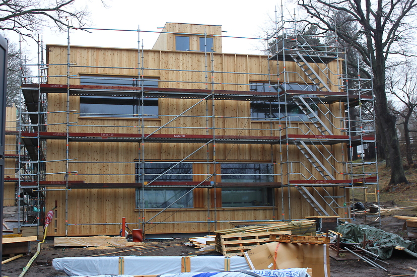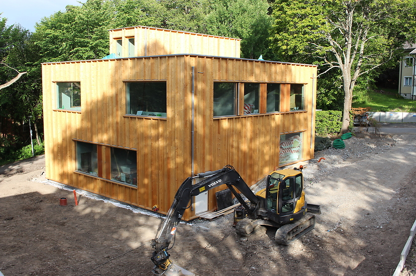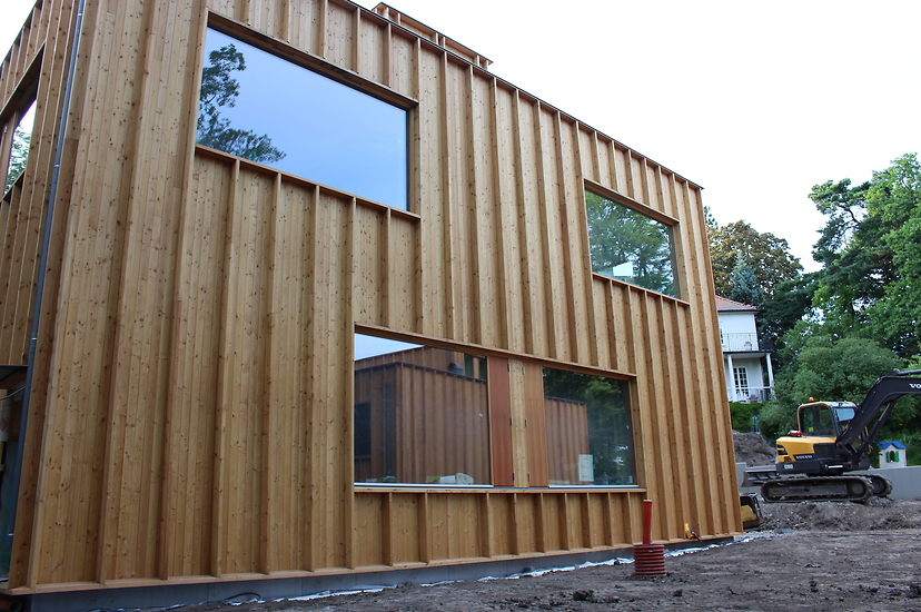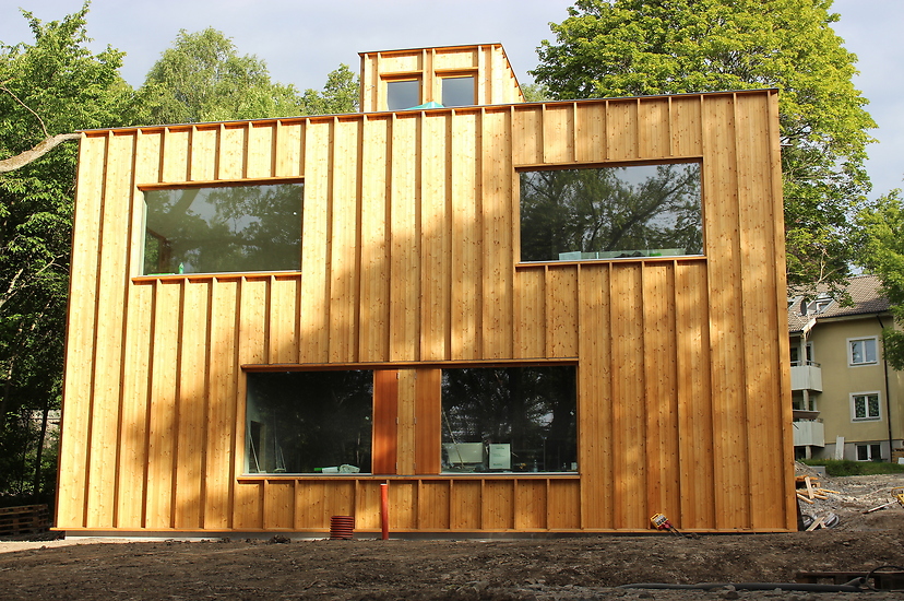 Vi har gjort allt yttre och inre träarbete, medan Falkenbergs reste stommen. Hustypen är ett arkitekritat modulhus från Sköna Hus.