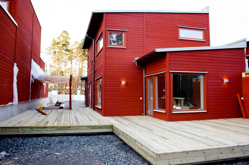 Exteriört bygger vi trädäcken till altanerna vid varje hus. Arbetena utförs av Saver Bygg på uppdrag av Falkenbergs Bygg AB.