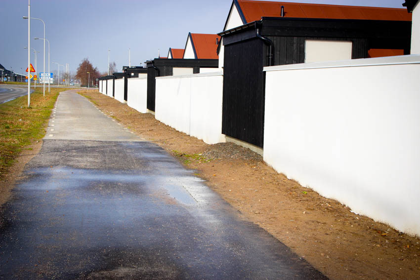Vi byggde totalt över 150 meter mur i Löddeköpinge. Muren av Lecablock. isolerar de nybyggda bostäderna mot trafik och buller. Projektet utfördes som underleverantör till Mjöbäcksvillan.